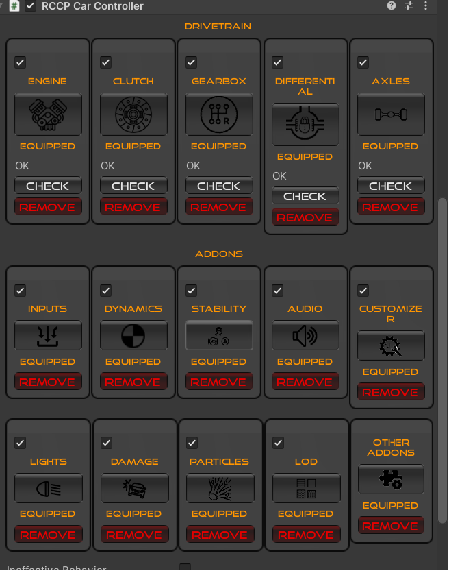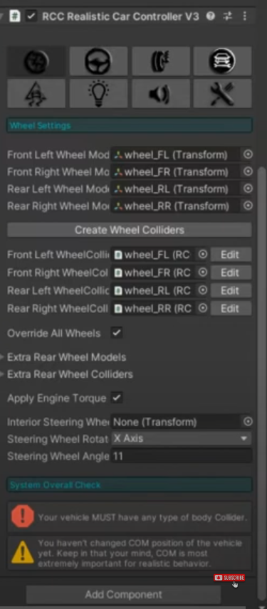 Merhaba arkadaşlar açık dünya bilgisayar araba oyunu geliştirmek için Unity oyun motorunda olan Realistic Car Controller assestini satın aldım, araç kurulumu vs. aslında çok kolay fakat karışık geldiği için tutorial izlemeye karar verdim. İnternette Realistic Car Controller tutorial'ı var fakat benim satın aldığım assest "Realistic Car Controller Pro v1.44.0"; bunun herhangi bir tutoriali yok ve nasıl yapacağım hakkında çok kararsız kaldım. Normalde araç modelini atar component'den, controller scriptini eklersiniz ve tekerlekleri vs. seçip yerlerine atarsınız. Tutorial'da da aynen bu şekilde yapıyor fakat benim assestimde bunun yerine ekte gördüğünüz gibi tekerlek kısmı yerine dinamik, motor, ses gibi daha gelişmiş şeyler var. Assestin demosunu kuruyorum aracı haritayı falan atıyor fakat araç yine hareket etmiyor. İlk görselde gördüğünüz bende olan, ikinci ise tutoriallarda olan. Bu arada demo kuruyorum dedim ya herhangi bir tuş yerine ui atanmış mobil için fakat uiler çalışmıyor bazıları gözükmüyor.
