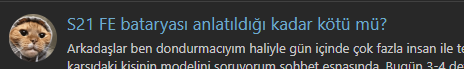 Öyle bir dünya yok hocam, o telefona sim kartı taktın mı kutusunu ambalajını açtın mı senden geri almamak için tüm zorlukları önüne koyarlar. Diğer yandan daha yeni cihazı satmakla mı uğraşacağız. O yüzden bu süreçte iyi karar verip tek seferde telefonu alıp geçmek lazım. Olay artık karman çorman bir hale geldi. Kimisi iyi gömüyor, kimisi iyi övüyor. Sana kalırsa S21FEde batarya problemi iddia edildiği gibi değil. Yalan söylüyorsun gibi bir iddiam yok bu arada, sen idare ettirebiliyorsundu lakin bu benimde aynısnı yapabileceğim anlamına gelmiyor, herkesin kullanımı farklıdır. Bak yukarıdaki arkadaşta s21fe kullanıcı, adam şarjından illallah etmiş gidip gt2 aldım rahat ettim demiş. Diğer konumda var s21fenin şarjından muzdarip olanlar. Ürünün satış kanallarının yorumlar kısmında da var. Yine bu bölümde öneri yapan bilgili arkadaşlarda bu şarj olayını biliyor kabul ediyor. Yani bu beni kuruntum değil, yanlış anlamasın. Olay aslında biraz kullanım şekline göre değişmesinde, az kullanırsın az gider, çok kullanırsın çok gider. Ben oturup sabahtan akşama ful başında geçirmeyeceğim, lakin ful internet açık olcak. Programlar açık olacak, sosyal medyalar, bildirimler açık olacak. Programlarını yoğun kullanırım. Yeri gelir öğlen arasında oturur video izlerim, yeri gelir dolmuşta dizi izlerim veya oyun oynarım. Tabi bu saatlerce sürecek bir eylem değil ama gün içine yayılınca ne olur bilemiyorum sadece. Yeter mi yetmez ne olur kestiremediğimden bu olsun diyemiyorum ister istemez. Hiçbir reklama inanmayın, hepsi ürünü pazarlama taktikleri. Gidin GTnin sitesine, bakın özelliklere. Sanırsın uzay teknolojisiyle uzaylılar yapmış.
