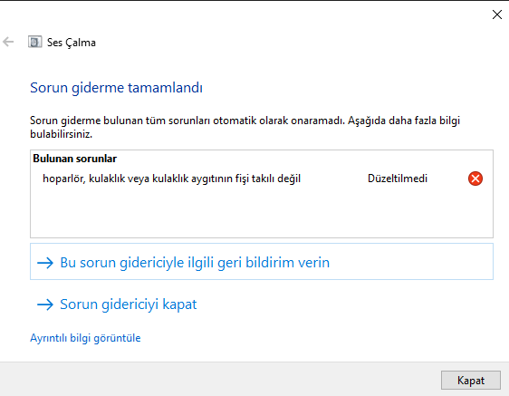 Görselde de gördüğünüz gibi Windows Sorun Giderme'den de böyle bir mesaj alıyorum. Fakat aslında kulaklık yeri v.s takılı. Kasanın önüne de taktım giriş yerlerini arka kısımlarına da takmayı denedim fakat gene de aynı şeyi söylüyor.