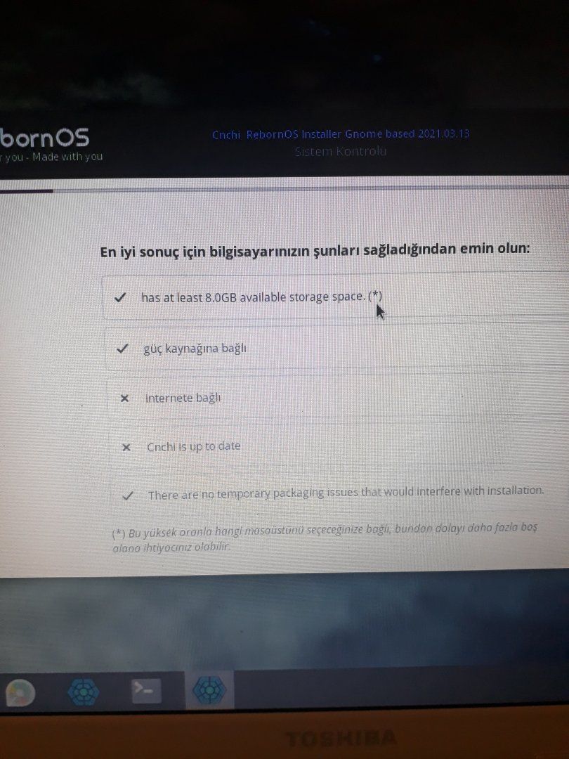 Arkadaşlar merhaba. RebornOS kurmaya karar verdim. Fakat fotoğrafta görüldüğü gibi "x" işareti olanlar var. Bu yüzden kuruluma devam edemiyorum. Nasıl çözebilirim? ISO dosyası doğru.
