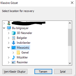 recover butonuna bastıktan sonra program bizden kurtarılan dosyaların nereye kaydedileceğini sorar. Ben masaüstünü seçtim siz istediğiniz yeri seçebilirsiniz. Dosyaların nereye kayıt edileceğini seçtikten sonra "tamam" butonuna basıyoruz.
