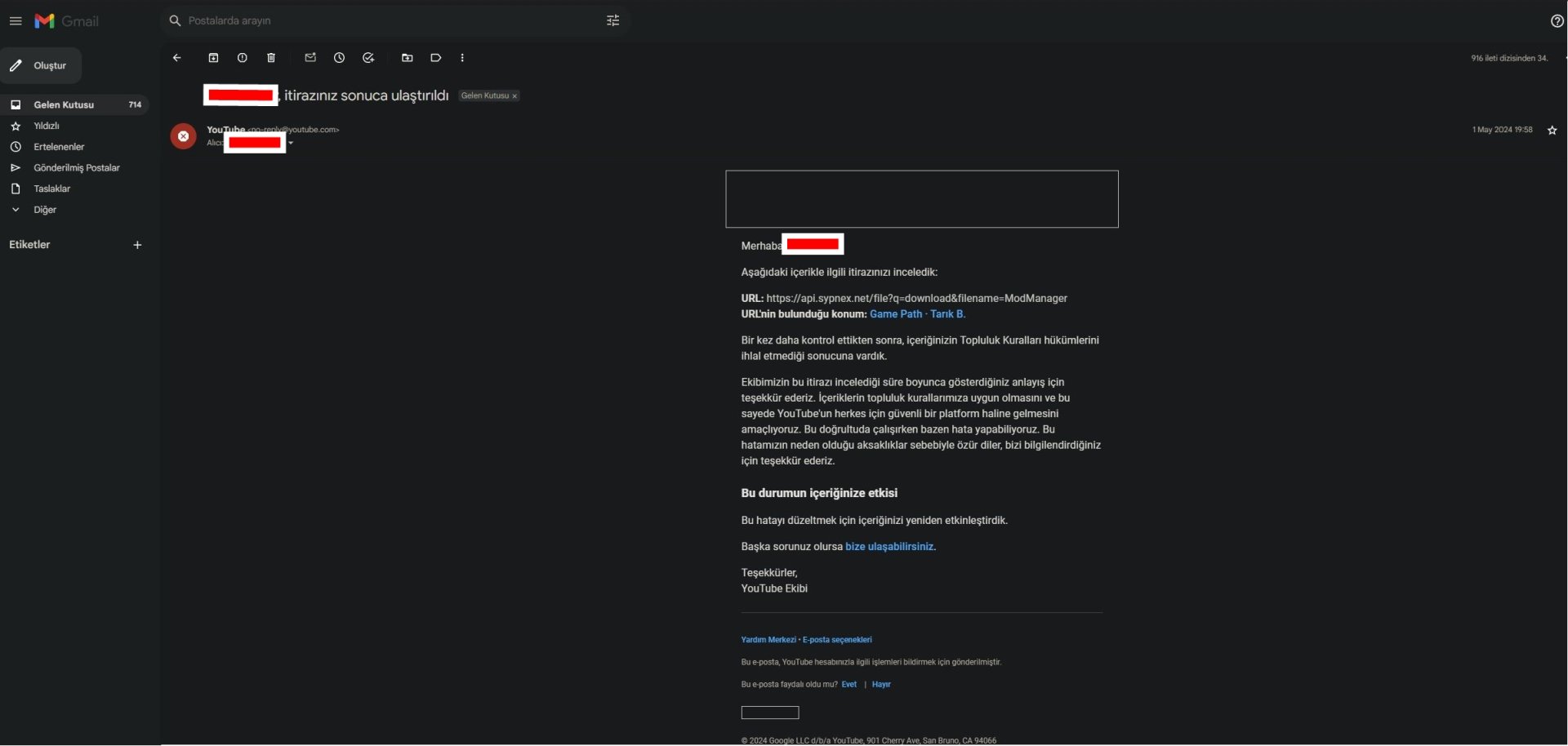 Videoyu izledim orada bahsetmişsiniz zaten virüs olarak algılıyor diye sıkıntı yok. Discord kanalında paylaştığın bu bilgilendirme ekran görüntüsünü de gördüm fakat Mod Manager indirme linkine tıkladığımda bir süre bekledikten sonra zaman aşımı gibi bir uyarı veriyor bir türlü indiremedim. Discord kanalında da v1.1.2 verilmiş onu gördüm videoda v1.1.5 gösteriliyordu. Gece saat 3-4 gibiydi cevap verecek kimse yoktur diye yazmadım en son sıkılıp bıraktım