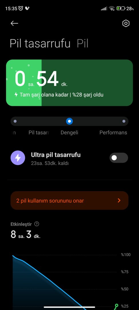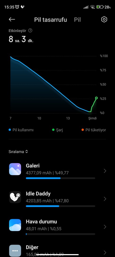 Olay dün okulda basladı 100 şarjla gittim (8.20) elimi telefona sürmedim, açmadım bile saat 11'de cebimden çıkardım ısınmıştı, niye bilmiyorum şarjı 65'e inmiş dokunmadım bile telefona. Bildirimlerden mi diye bütün bildirimleri kapadım ve ekran kapanma süresini 1dkdan 15sn ye indirdim her şeyi yaptım yok yine aynı. Sonra 1 bölüm anime izliyim dedim izlemez olaydım 65'ten 30'a düştü. Sonra hiç dokunmadım telefona eve gedlmi %7. şarja taktım dokunmadım PC deydim tam tamına 2.5saat sonra %45 olmuş normalde 1 saatte fulleniyordu hızlı şarj özelliği vardı. Telefon normalde okula 100 şarjla gittiğimde eve beni 40 şarjla getiriyordu 20'nin altına inmiyordu o gün Full kullansam bile. Bu sabahta bunun yüzünden okula kalkamadım. 100 şarjla akşam çıkardım yatagımın basına koydum sabah telefon açılmıyordu alarm çalmamış o yüzden. 7 saatte telefon kapalı olmasına rağmen şarjı bitmişti. Batarya masrafı çıksın istemiyorum zaten pahalı bir şey. Baska yollar var mıdır?