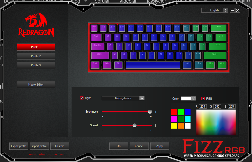 Uygulamayı indirmek için Redrogan kendi sitesine girip "K617 Fizz" olan klavyeyi seçip "Software" yazan yere tıklıyorsunuz. Programı kurduktan sonra karşınıza 3 adet profil çıkıyor. Eğer Profile 1 seçerseniz profile 1'de seçtiğiniz ayarlar uygulanır. Işık hızını ve opaktlığınıda alttaki çubuklardan ayarlayabiliyorsunuz.