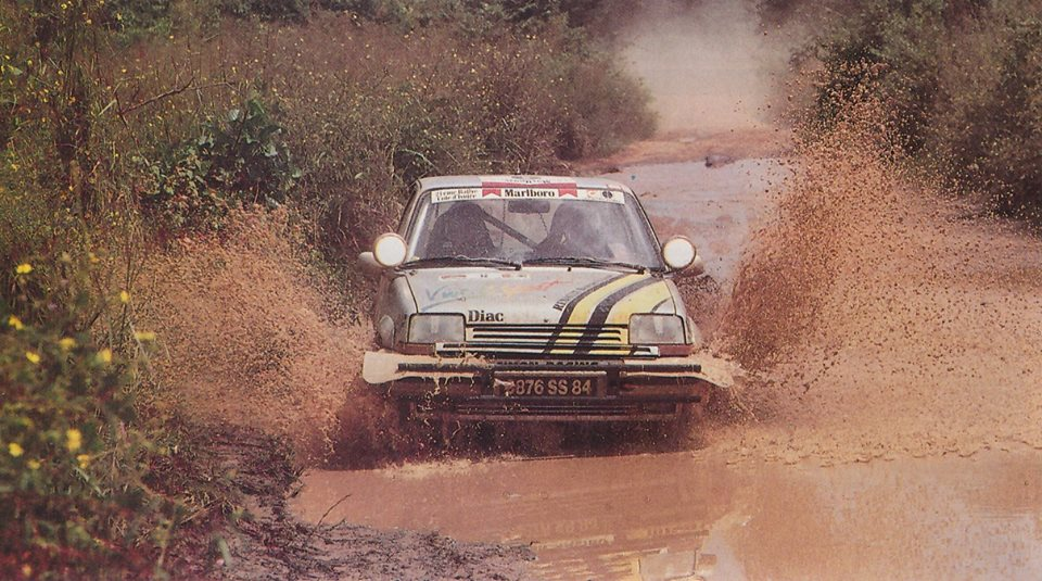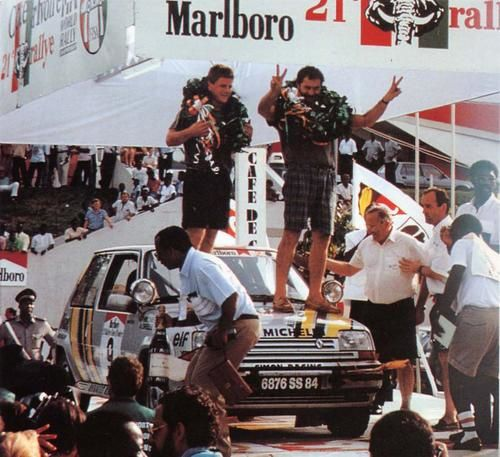 (Sürücü Alain Oreille ve yardımcı sürücü Thimonier Gilles; Renault 5 GT Turbo ile kazandıkları WRC şampiyonluğunu kutluyor, Rallye Côte d'Ivoire 1989)