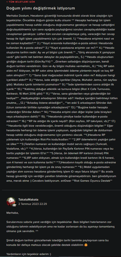 Selam. Benim bilgisayarıma yakın zamanda virüs bulastı ve bütün Gmail'lerimi çaldı bunun üstüne Riot hesabımda gitti. Ticket attım fakat hesabımın ilk Gmail'ini hatırlamadıgım için bayağı bir sorun oluyorlar daha fazla bilgi gelmiyor hakkıma hesapla ilgili ve zamanımda tükeniyor ne yapabilirim?