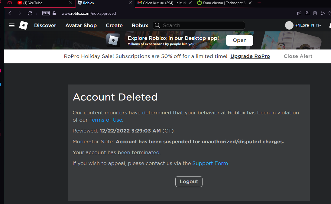 Bir süredir Roblox oynamıyordum ve çerezleri temizlemiştim, hesaba tekrar girdim bu yüzden ve hesabımın silindiği yazısıyla karşılaştım. Hesabımda şüpheli ödemeler yapıldığı yazılıyordu fakat sadece 1 kere Roblox dışında siteden Robux almıştım.