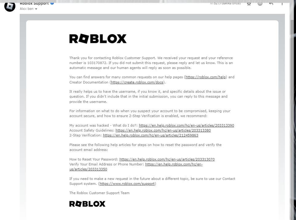 Roblox müşteri hizmetlerinden bir mesaj almışsın. Mesajda, talebin alındığı ve referans numaranın 103370872 olduğu belirtiliyor. Ayrıca, sık sorulan soruların cevaplarını Roblox'un yardım sayfalarında bulabileceğin ve hesabınla ilgili sorunların çözümü için daha fazla bilgi vermen gerektiği söylüyor.