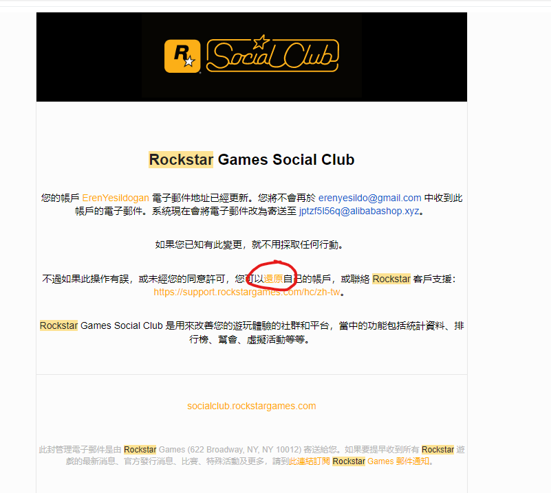 Aynı şey benim başıma da gelmişti. Çince bir mesaj ile e-posta değiştiği söylenmişti. Çözümü çok basit. Rockstar'dan gelen tüm e-postalara tek tek bakın, bir link göreceksiniz. O linke tıklayıp direkt kendi e-postanıza alabilirsiniz tekrardan.