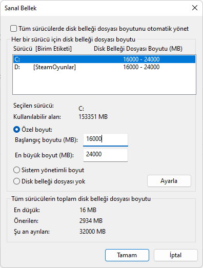 Sanal belleği RAM belleğimle eşit yaptım. Tam ekran iyileştirmelerini kapattım.
