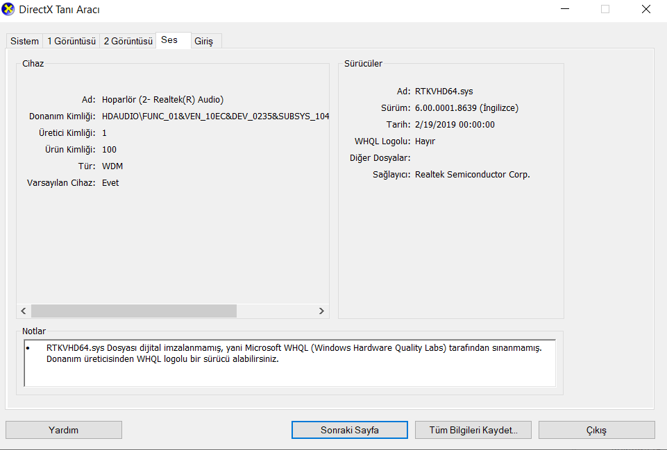 Dxdiag'a girdiğimde şöyle bir şeyle karşılaştım.