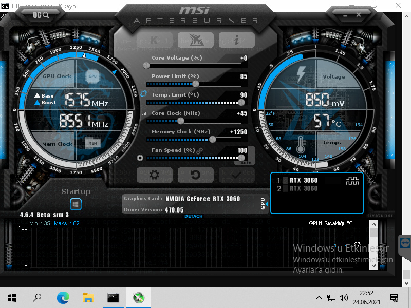 Core clock voltage grafiğinde 700 mv ye CTRL+L kombinasyonu ile sabitleyin. Core clock frekansınıda 1035'e gelecek şekilde ayarlayın yani şu şekilde öncelikle normal ayarlara dönün Core clockun yanındaki 3 çubuk ikonundan grafiğe girin. 700 mv ye denk gelen kutucuğun üstüne tıklayıp CTRL+L ye basın. Sonrasında baktınız Core clock misal olarak 1235 MHz de çalışıyor. Core clock çubuğundan -200 MHz şeklinde ayarlayın ve 1035'e denk getirin. Bu şekilde deneyin bir de bakalım RTX 2060 MSI Ventus modelinde halihazırda 84 Watt'ta 32.30 mh alıyorum. Core clock seviyesinin 30+ veya 30 - şeklinde kombinasyonlarla deneyebilirsiniz duruma göre değişkenlik gösteriyor en ideal değeri deneyerek bulacaksınız. Power limite dokunmanıza gerek yok zaten voltajı kitliyorsunuz herhangi bir etkisi yok. Ve + olarak mh kazanmak istiyorsanız ekran çözünürlüğünü 800x600 e alın.