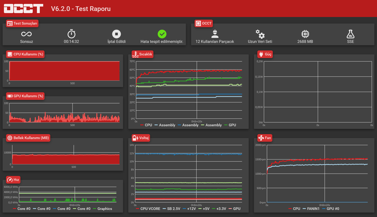 OCCT Testim aşağıdaki resimdedir. Gözlemlediğime göre ekran kartındaki sıcaklık değerleri yüksek değil, işlemcinin de yüksek değil ama ekran kartını stress teste soktuğumda bilgisayar kapanıyordur. Size ayrı bir sorum ise ekran kartının sıcaklığı neden artmıyor? Sanki 55 dereceyi geçtiğinde bilgisayar korumaya alıp kapatıyor gibi hissediyorum. Yardım edebilirseniz teşekkür ederim. Not: Herhangi bir oyuna girdiğimde direkt oyun kapanıyor.