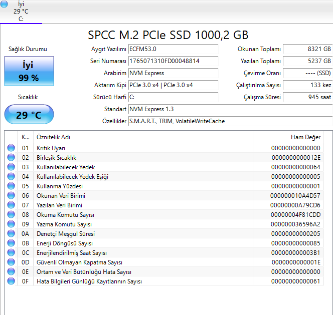 CrystalDiskInfo adlı yazılımı yükleyip SSD sağlınığınız kontrol eder misiniz?