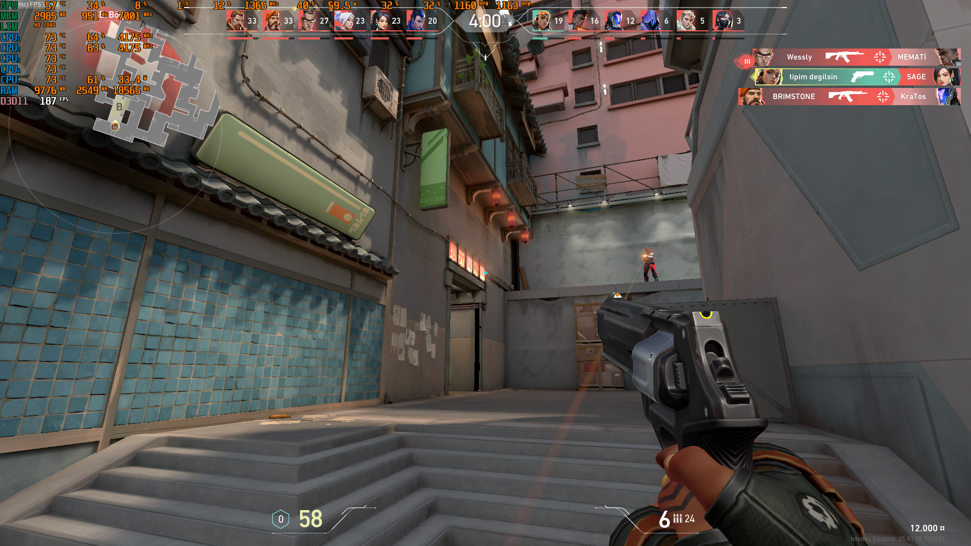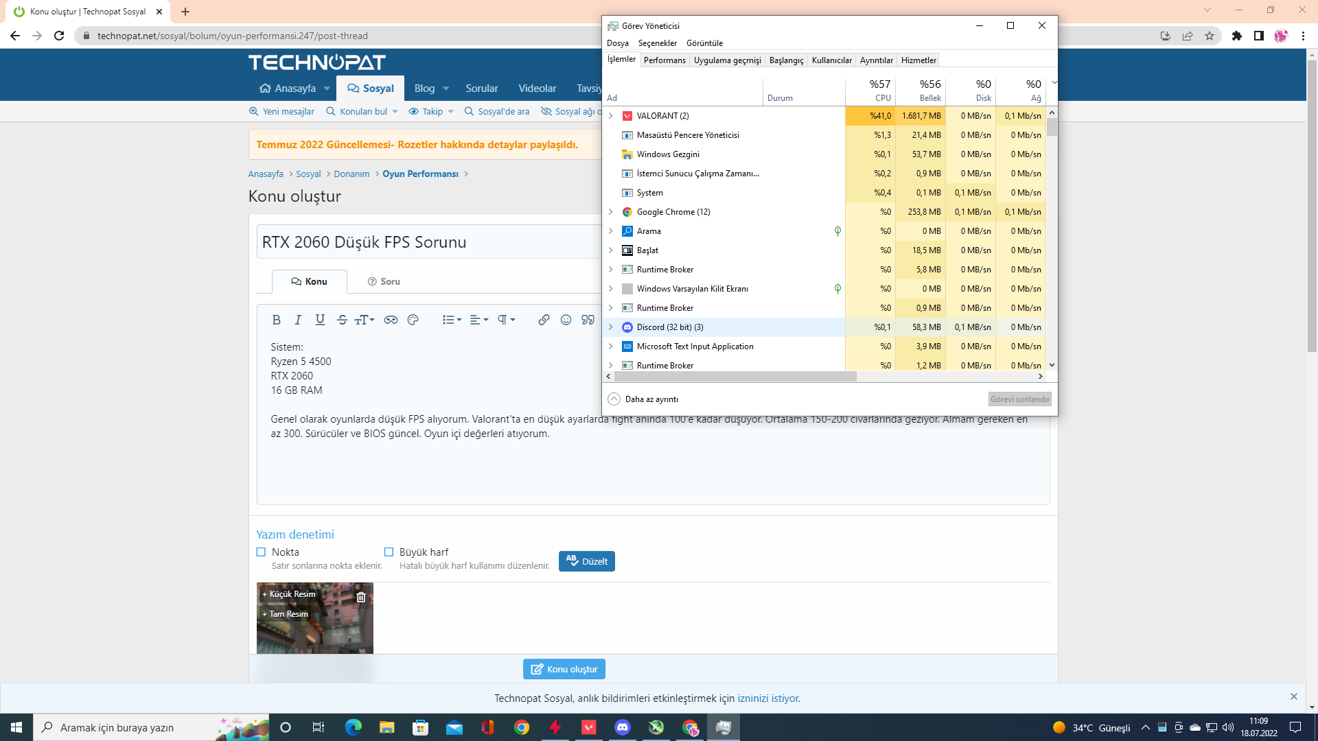 Genel olarak oyunlarda düşük FPS alıyorum. Valorant'ta en düşük ayarlarda fight anında 100'e kadar düşüyor. Ortalama 150-200 civarlarında geziyor. Almam gereken en az 300. sürücüler ve BIOS güncel. Oyun içi değerleri atıyorum. Bana işlemci çok kullanılıyor gibi geldi.