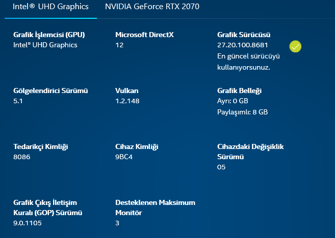 Şimdi PC güç tasarrufu ile alakalı sanırım İNTEL UHD kullanıyor. Ben oyunlara veya Programlarımı kullanırken RTX2070 i görüyorum zaten çalışıyordu.. Ben sağ tarafa monitör taktım PC de oynarken yan ekrandada videoları izleyim yada sadece browser amaçlı kullanayım. Lakin örn. RDR2 açıyorum ultra ayarlardaki oynadığım oyun resim resim oynanıyor yarım saatte falan açılıyor. resimdeki gibi sanırım oyunu İNTEL UHD de açıyor RTX2070 den eser yok