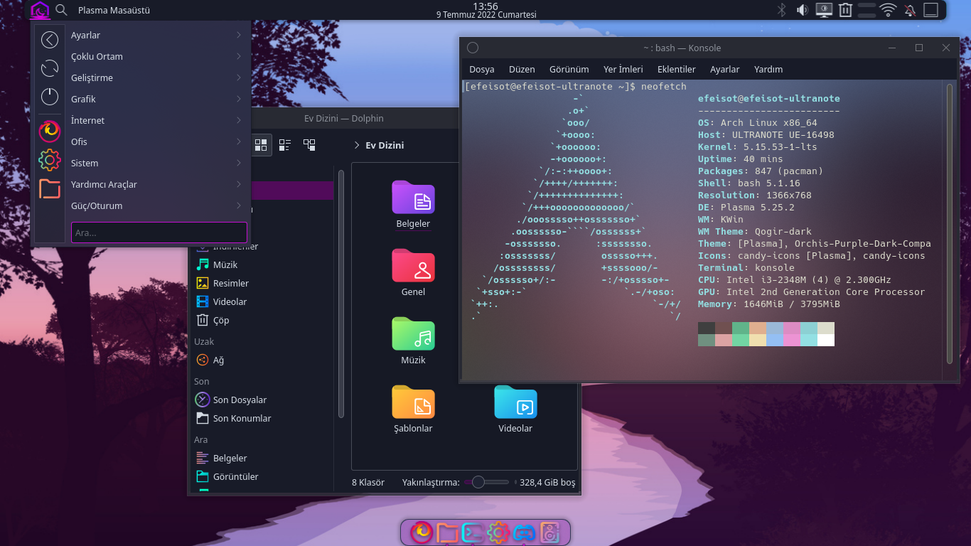 Fedora Gnome/KDE/Cinnamon/XFCE/Mate veya LMDE kurabilirsiniz; GNU/Linux için Java Minecraft'ın native desteği var, yani daha fazla performas alabilirsiniz Windows'a göre. Ayrıca masaüstü görüntünüzü kafanıza göre şekillendirebilirsiniz. Mesela benim masaüstü ortamım böyle (Arch Linux - KDE Masaüstü Ortamı):