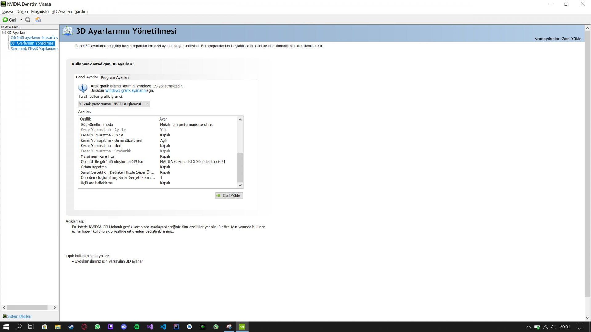 Aşağıdaki görev yöneticisi görüntüsünü Rocket League oyununda 1K ayarlarda her şey en yüksek değerlerde iken pencereli modda aldım. Elbette 3060 GPU'sunun kullanımı az çıkacaktır bu durumda ama asıl sıkıntı şurada. Oyunu tam ekrana alıp MSI Afterburner ile yaptığım testlerin (2K, 1K, yüksek ve düşük çözünürlüklerde) hiçbirinde GPU1'in (3060 olduğundan eminim) %90 seviyelerine ulaştığını görmedim. (Aynı zamanda işlemcim de daima %30 civarlarında seyretti). Daima %30-60 arasında gidip geldi ki bununla beraber GPU2 (Intel Graphics) %85'in hiç altına inmedi. Daha sonrasında bilgisayar üreticimle görüşüp sadece regedit üzerinden 2 değeri değiştirdik (Diğer değerler hepsi yüksek performanstaydı. Onların da görüntülerini aşağıda paylaşıyorum.). (Regedit görüntüsündeki son 2 değer Medium'dan High'a alındı.)