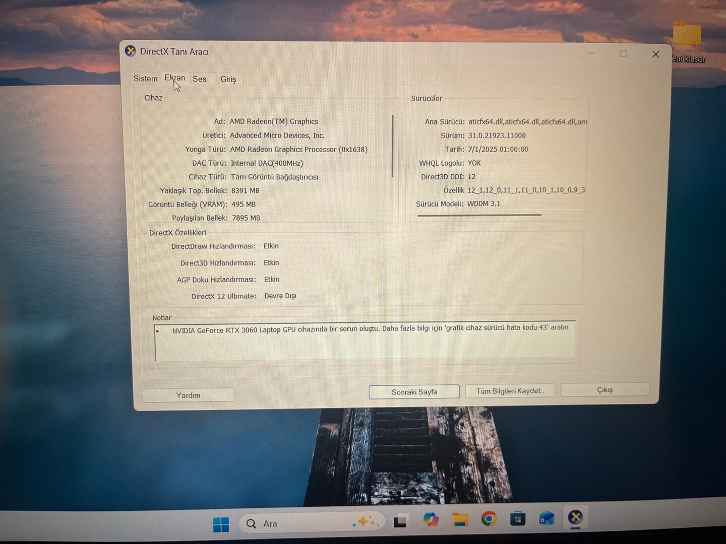 Cihazım ASUS ROG STRIX G513Q (Ryzen 9 5900HX + RTX 3060). NVIDIA ekran kartı Windows tarafından görünmesine rağmen hiç çalışmıyor. Aygıt Yöneticisi'nde sürekli Hata Kodu 43 çıkıyor.