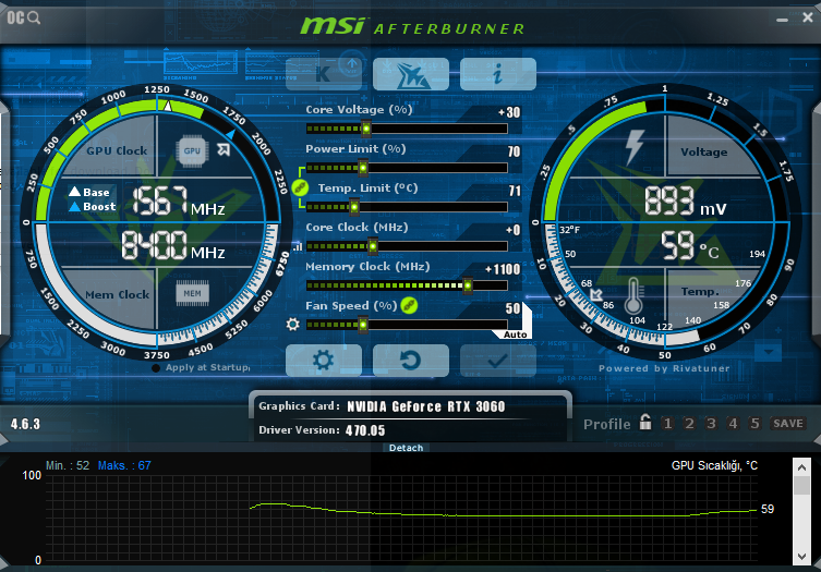Ekran görüntüsünü yeni gördüm. 2 gün önce birine ayar yaptım power 70 memory 1200 core -400 kullanıyordu 48mh'dan yukarı çıkaramadım. Palit 3060 Duo modeldi. Modelden modele çok farkediyor anlaşılan.