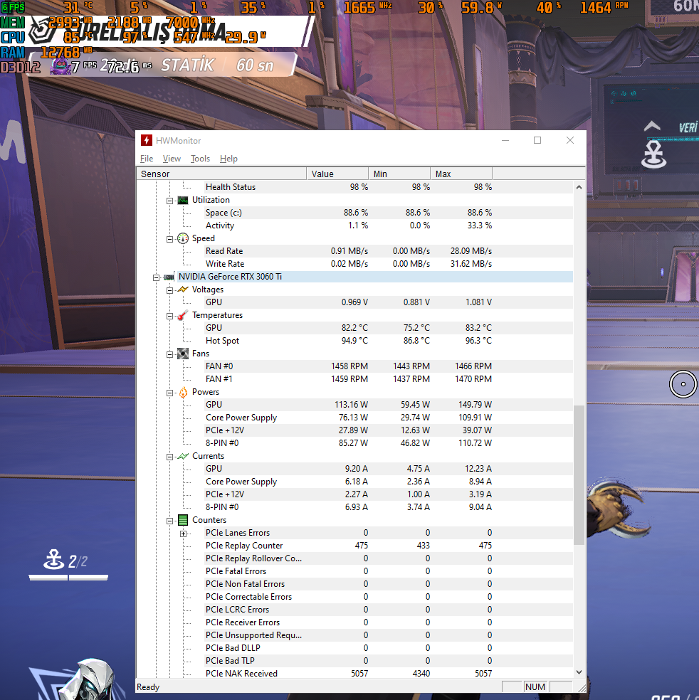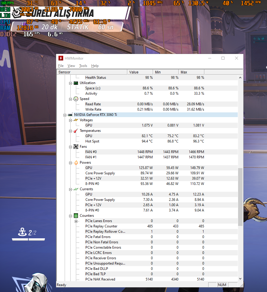 Merhaba dostlar. Bilgisayarda oyun oynarken yüksek FPS alıyoruz ama FPS' anlık olarak 2-10 arasına düşüyor 10 saniye sonra düzeliyor. HWMonitor ve MSI + RivaTuner'le değerlere baktığımda; FPS yüksekken işlemci ve ekran kartında sorun gözükmüyor ama lim: Voltage yazısı çıkıyor. FPS düştüğünde ise ekran kartı voltajı 1.050'den 0.881'e düşüyor ve kullanımı %10'lara iniyor. İşlemcide ise tam tersi oluyor. FPS düştüğünde işlemci kullanımı %97'lere çıkıyor. Fotoğraflara bakarak daha iyi anlarsınız. Bu bilgisayar 2. el alındı ve macunu yenilediğini söylemişti. Bilgisayar arkadaşlarıma ait ve çok fazla anlamıyorlar. Ben de uzakta olduğum için fiziksel bir yardım yapamıyorum. Sizce sorun nedir? PSU arızası böyle bir şey yapar mı? Driverlar ve BIOS güncel. İç temizliğini fiziksel olarak yapamadığım için bilmiyorum. Bilgisayarcıdan önce size danışmak istedik.