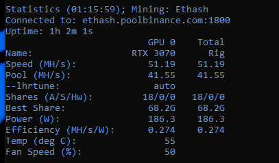Yaklaşık 50Mh'de kazıyorum yani maksimum 53'ü gördüm. Overclock yapma olayını bilmiyorum ekran kartının garantisini bitirmek istemiyorum 1 yıllık cihaz ocak ayında alındı. Fan'ı programdan %50'ye ayarladım başka hiçbir şey yapmadım. Şu anda durdurdum ve soracağım 2 soru olacak.