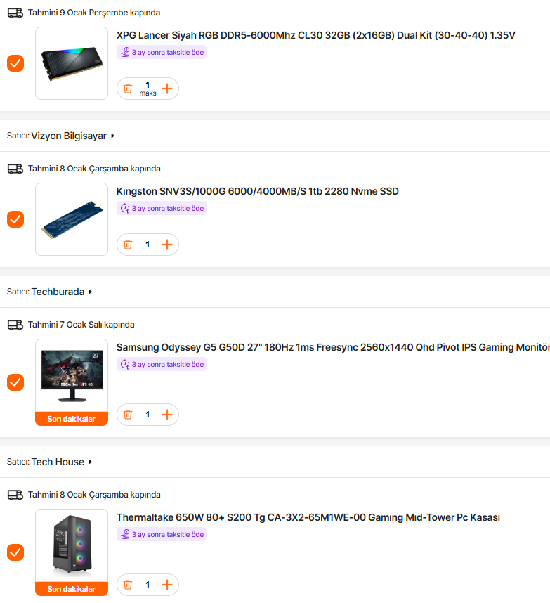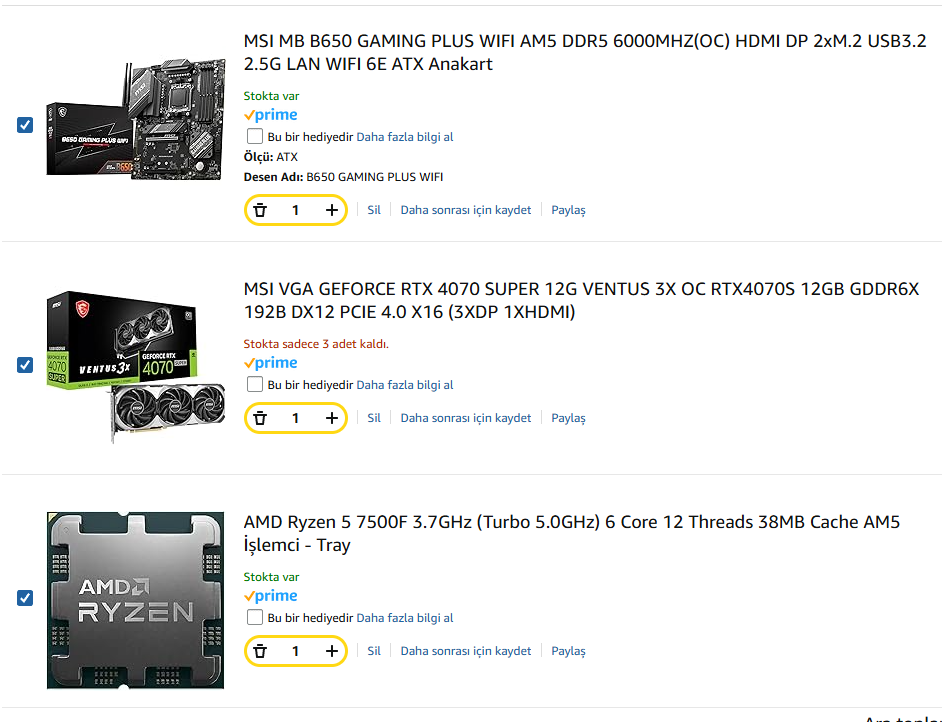 İllaki bunlar şart değil taksitli olma durumuna bağlı olarak muadilleriyle değiştirebilirsiniz ama her türlü sizin topladığınıza göre bir tasarruf sağlıyor. fakat bana kalsa neredeyse aynı performansta olan rx 7800 xt modelini tercih ederdim buda -5000 tl bir tasarruf sağlar. https://www.akakce.com/ekran-karti/...20g-256-bit-gddr6-16-gb-fiyati,293257013.html
