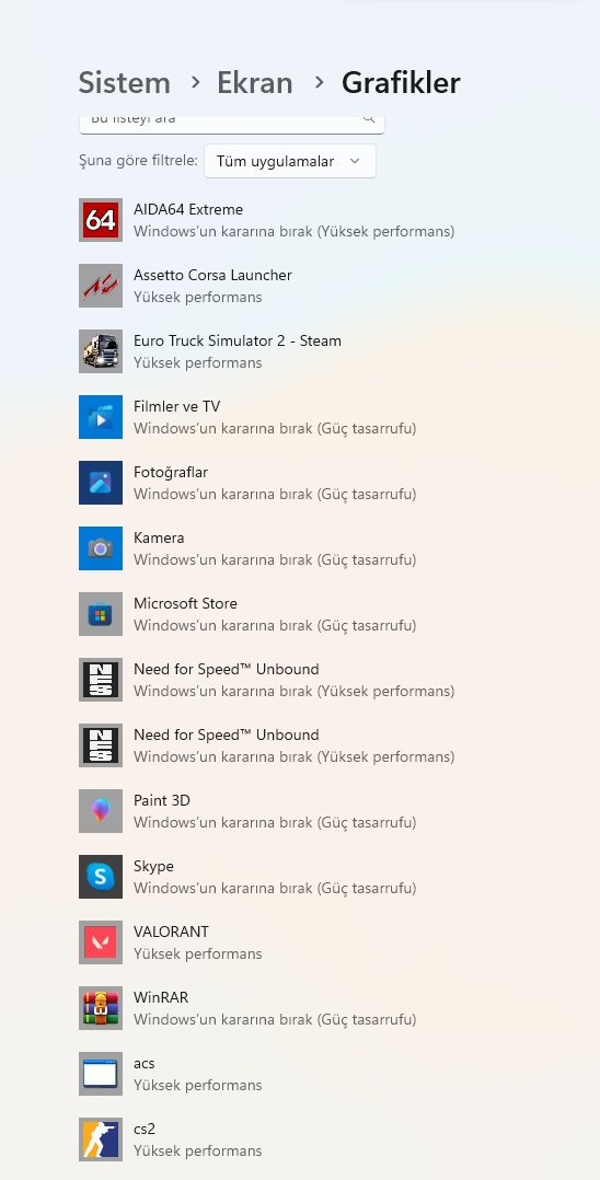 Hocam masaüstüne sağ tık basın görüntü ayarlarına gelin sonrasında grafik ayarları orada göz at yazacak ona tıklayıp Assetto Corsa'yı seçin seçtikten sonra oyuna sol tık atın seçeneklere gelin oradan yüksek performansı seçin.
