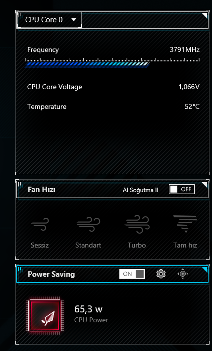 İşlemciyi soğutamıyorum da bazı oyunlarda 80-100 derece arası gidiyor. 170W da ve 5.2GHz de çalışıyor. Sıkıntı olur diye ASUS'un anakart uygulaması olan Armoury Crate'de Power saving modunu açıyorum. 170W'dan 65W a sabitliyor kendini ve işlemci 4GHz'lerde çalışıyor. FPS de farklılık olmuyor benchmark testindede 170W da 14500 65W da 10000 alıyor. Eğer işlemciyi 130 140W da çalıştırabileceğim bir ayar olsa çok rahatlayacağım. 70derecede falan çalışır o zaman