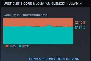 İlk olarak Steam'den aldığım AMD işlemci ve Intel işlemci grafiğini göstermek istiyorum. Gördüğünüz gibi AMD rekabetçi bir işlemci çıkarttığı için pazar payını gözle görülür bir miktarda yükseltmiş. Yani toplumlar sadece markaya değil performansa bakıp kitlesel bir değişim yapabiliyor.