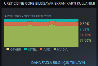 Bu eklediğim ise ekran kartlarının pazar payı burada AMD ve Intel'in yüksek gözükmesine bakmayın çünkü laptop kullanıcılarının ve APU sistemlerdeki ekran kartları yüzünden payları yüksek gözüküyor, gerçekçi araştırmalara göre ekran kartı piyasasının neredeyse %90-95'i hala NVIDIA tekelinde.