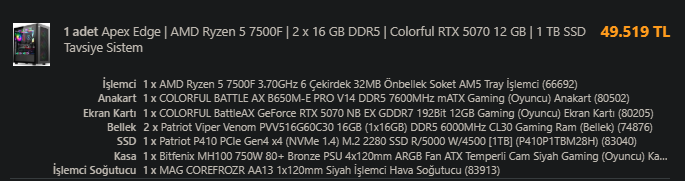 Benim başta attığım soğutma ve kasa eklenmiş haliyle 49.500'e gelen sistem ile bunun arasında kalmıştım. Siparişini de verdim baştaki sistemin. İptal etmeyi düşünebilirim çünkü uzun vadede dokunmak istemiyorum bilgisayara bir daha. Editin yanında oyun falan da oynuyorum.