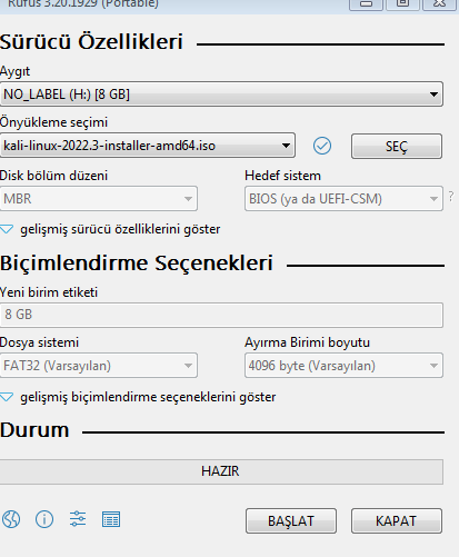 Rufus Kali Linux USB yazılmıyor böyle oluyor başlat diyorum başlatıyor bitti diyor ama USB boş.