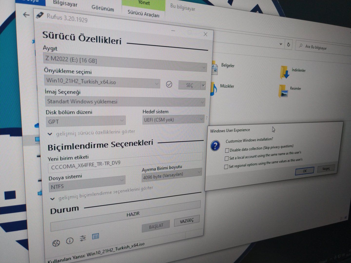 Rufus Windows 10 USB oluştururken çıkan sorular nasıl seçilmeli?