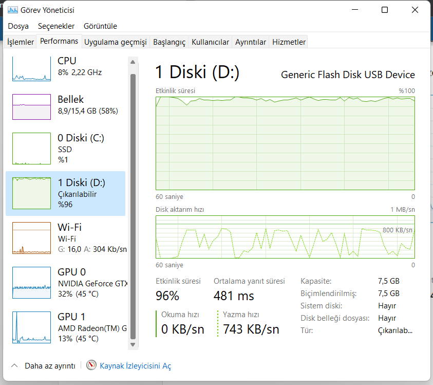 Bu görsele bakarsak USB can çekişiyor, SSD disk tıkırında çalışıyor gibi gözüküyor. Sorun USB bellekte gibi gözüküyor. USB'nin üstüne tıklayıp kaç MB veri yazdığına bakar mısınız?