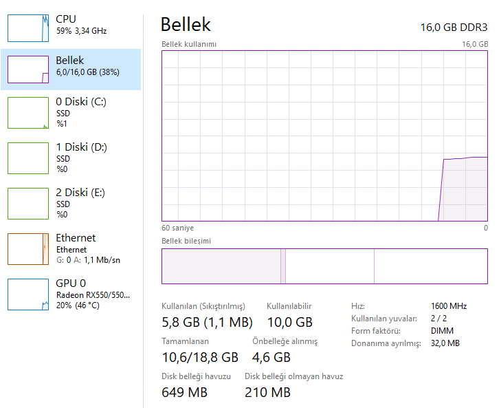 Bir de RAM'in hızı gerçekten 1600 MHz mi? Çünkü aşırı derecede düşük 2024 yılı için o da sebep oluyor olabilir.