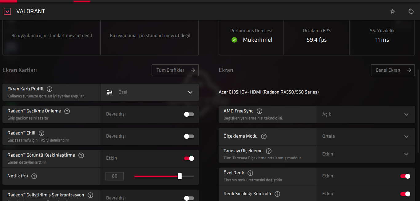 Ekran kartım RX550/4GB. Valorant'ta 120-190 FPS arası alıyorum ama oyun akıcı değil. Monitörüm LG 75 Hz 1ms.