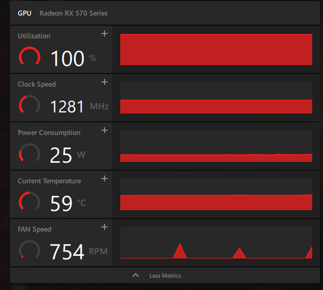 İyi günler hepinize, son birkaç gündür ekran kartımın fanı bir çalışıyor bir kapanıyor. Ben Görev Yöneticisi'nden kontrol ettiğimde ise ekran kartımın kullanımı boşta %3 ile %8 arasında değişiyor ne yaptığıma göre ama hiç sıcaklığa bakmamışım şimdiye kadar. Sıcaklığa baktığımda 58 derece yazdığını gördüm. Bunu gördükten sonra GPU-Z'yi açtım ve ekran kartı yükü %100 gözüküyordu. Sonra AMD Metrics'i açtım orada da %100 gözüküyordu.