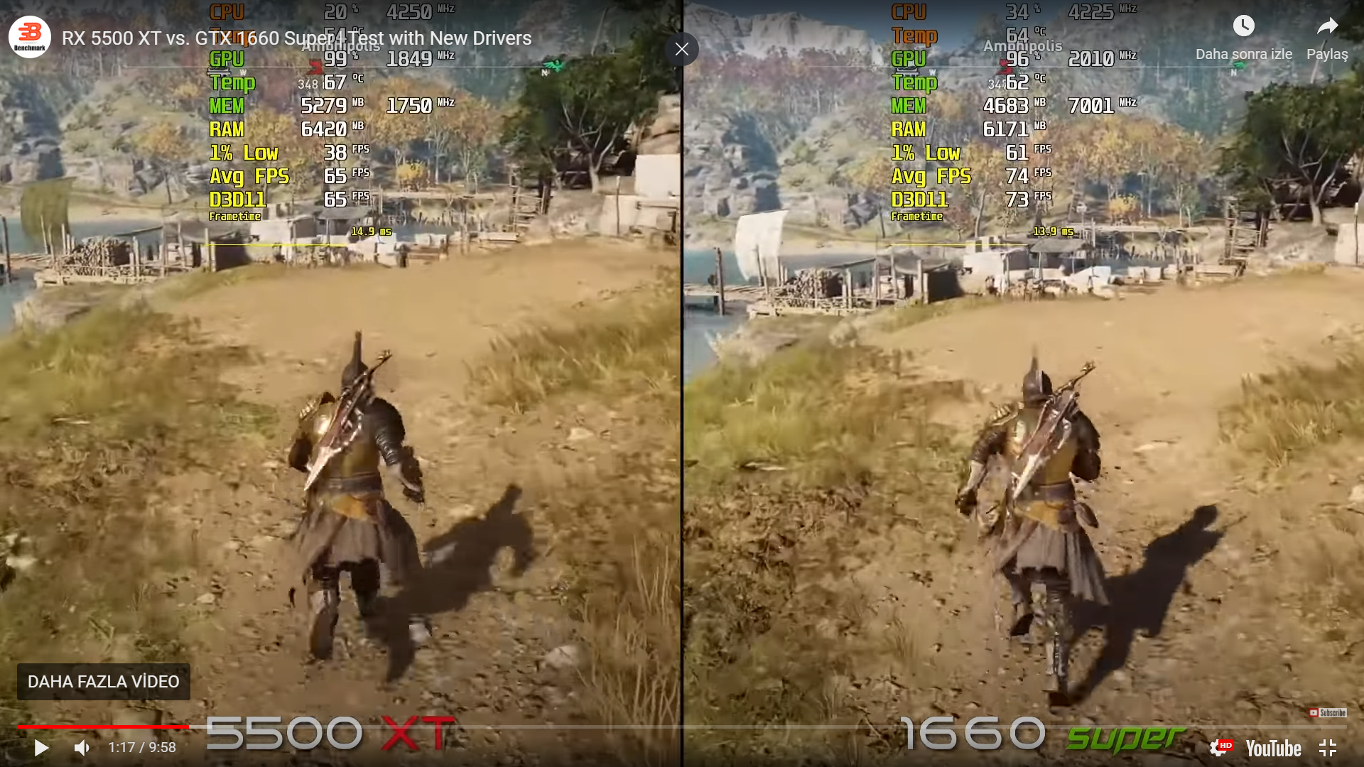 Oyun performansı olarak 1660'ın önde olduğu falan yok, birbirilerine gayet denk kartlar. Bazı oyunlarda 5500XT bir miktar önde olur, bazılarında 1660 önde olur ama performansları gayet yakın olan kartlar, birbirilerinin denkleri.