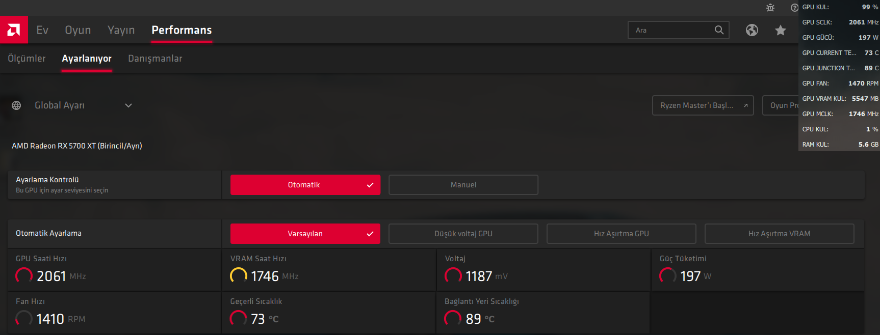 Ben 5700 XT Pulse modeliyle 85W elektrik tüketimi, 55 derece kart sıcaklığı yakaladım fanlar 800 rpm de dönüyor otomatik modda.