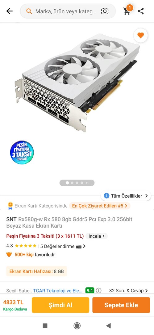 Snt RX580G-W RX 580 8 GB GDDR5 PCI exp 3.0 256bit beyaz kasa ekran kartı.