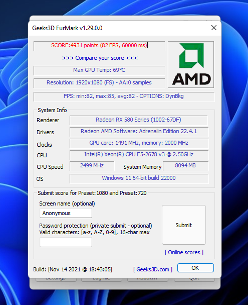 -Ekran kartım RX580 8 GB GDDR5 256bit Nitro. Kartım için en güncel yazılımı yüklemiştim ve şimdi eski sürümlere geçtim gene aynı sıkıntı var. FurMark testi sonucu aşağıdaki gibi.