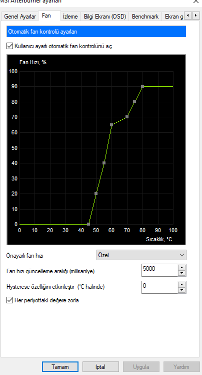 Fan ayarları: 55C/%18 - 60C/%20 - 65C/%40 - 70C/%60 - 75C/%80