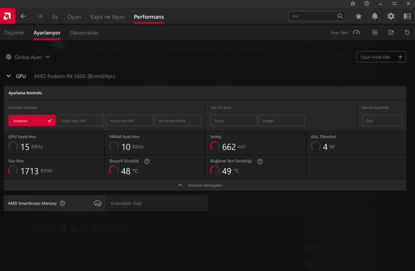 Merhaba. RX 6600 kullanıyorum 65 dereceye kadar ekran kartı fanı dönmediği için kasa çok ısınıyor. Fan 30 dereceye geldiğinde çalışmasını istiyorum nasıl yapabilirim?