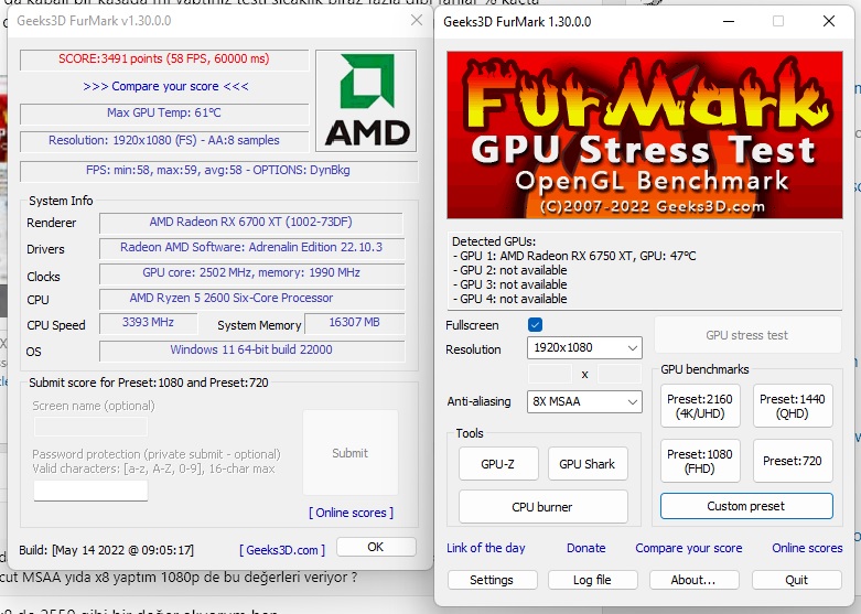 Şu benim aldığım Gigabyte rx6700xt 0XMsaa furmark sonucu: