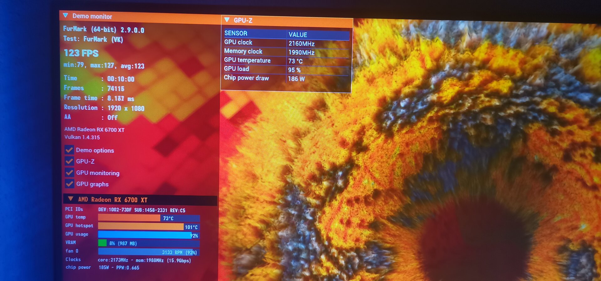 10 dakikada Max 73' 124 FPS ( fotoğrafa bakamayanlar olursa diye yazdım) bir de işlemciye yaptım benchmarktan onunda fotosu var sonuçlardan pek anlamadım.