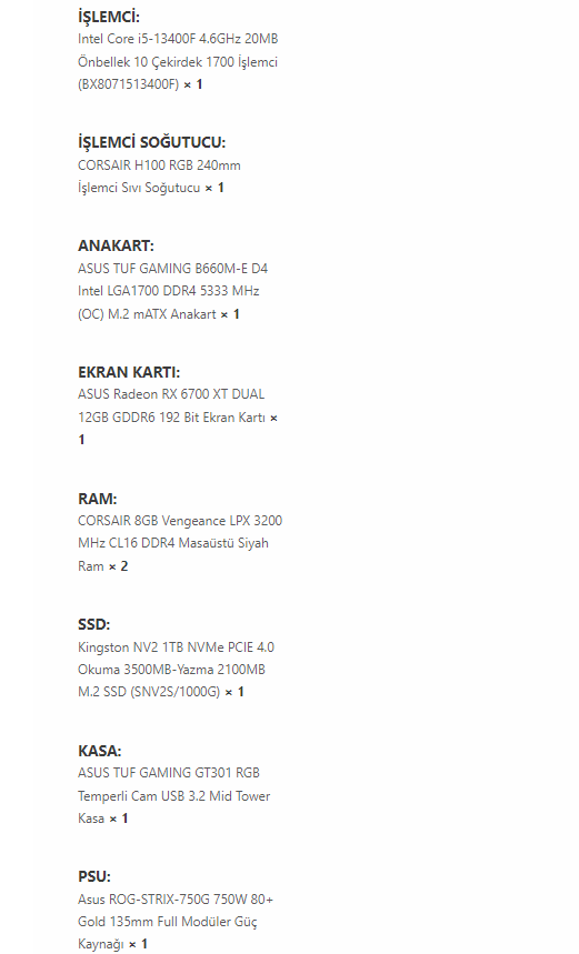 İlk sistemimi aldım ve öneriye dönük olması dolasıyla özelleştirmelerini yaptım. Amd tabanlı toplamayı planlıyordum ama İ5 12400F ve İ5 13400F arasında farklılıklar olduğu için ve i5 13400f ryzen 5 5600'den çok daha verimli olduğu için bu şekilde özelleştirmeleri yaptım. Sizce nasıl?