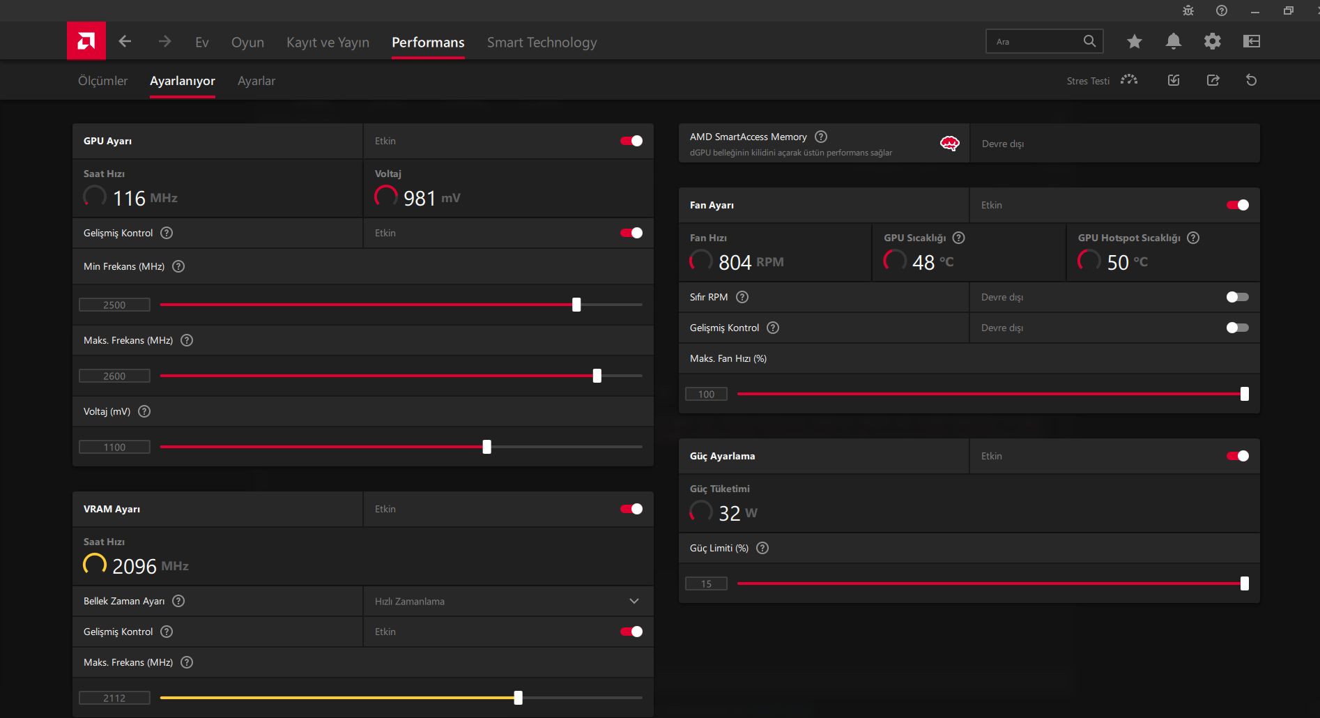 Arkadaşlar merhaba. Ben ASUS'un 6700XT modelini kullanıyorum ASUS'un 550W PSU'suna sahibim overclock hakkında bilgim yok, aslında performans olarak bir sıkıntım yok sıcaklık değerlerim de gayet iyi ama daha iyi FPS alabilir miyim diye merak ettiğim için YouTube'dan bakarak görseldeki ayarları yaptım. Önerebileceğiniz bir şey var mı bu ayarlar ekran kartına ileride zarar verir mi?