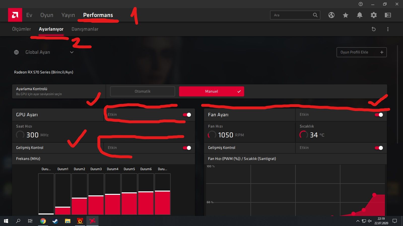 AMD Radeon sürücünüzü açın ve resimdeki adımları takip ederek ilk performans sekmesine tıklayın ardından Ayarlanıyora tıkladıktan sonra gelen sekmedeki GPU ayarı,Fan Ayarı etkinleştirin ve voltaj ayarını manuel yapın.