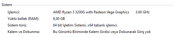 RX570 8 GB, Ryzen3 3200G 3.6GHz, 8 GB RAM.